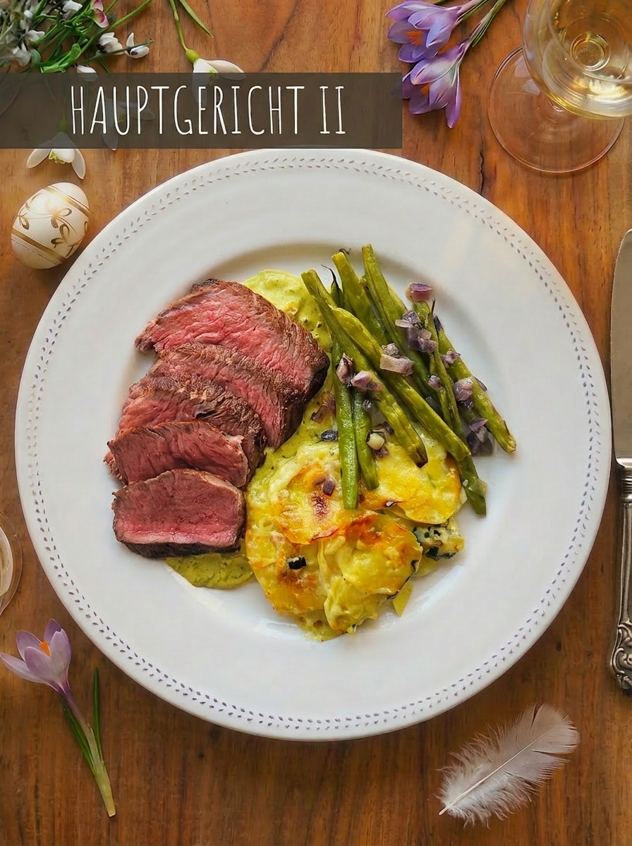 Rosa Rinderhüfte in Dijon-Weißweinsauce auf cremigem Bärlauch-Kartoffelgratin mit grünen Bohnen, süßen roten Zwiebeln & Estragon-Zitronenbutter