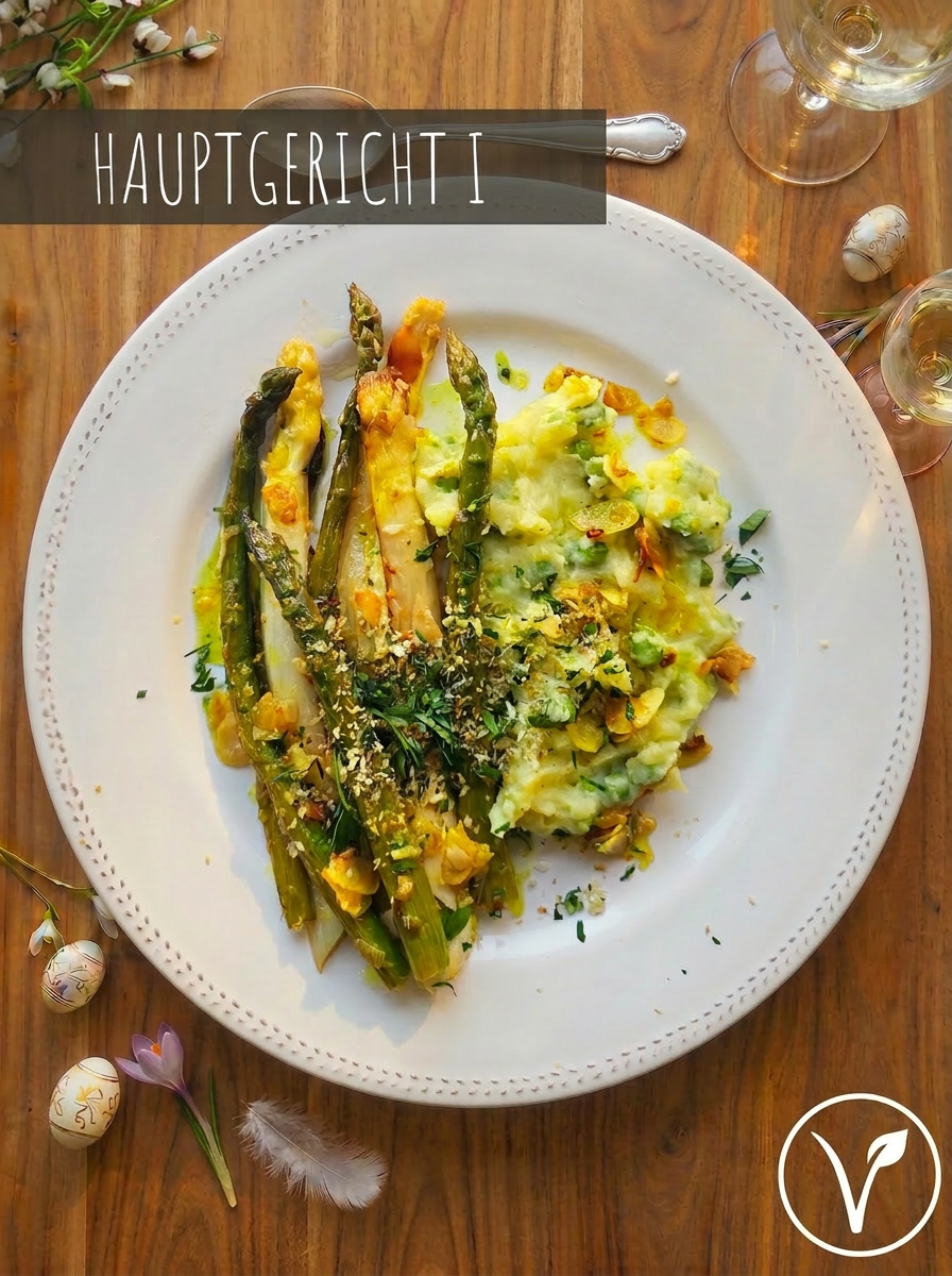 Zutaten: Spargel (grün & weiß), Kartoffeln, Erbsen, Mascarpone, Schalotten, Mandeln (gehobelt), Gemüsebrühe, Rohrzucker, Zitronenabrieb, Kurkuma, Pankobrösel, Muskatnuss, Knoblauch, Pertersilie (frisch)Benötigte Basiszutaten: Butter, Olivenöl, Zucker, Salz, Pfeffer