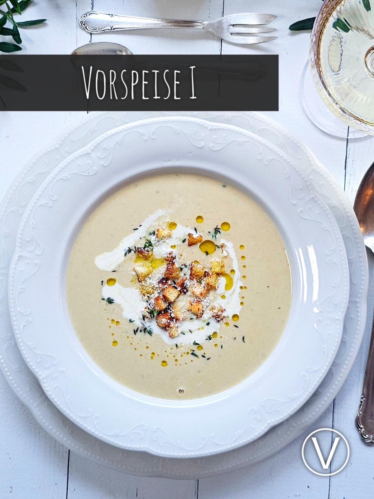 Diese Suppe bringt genau die Wärme an den Feiertagstisch, die man sich wünscht: cremiger Lauch, nussige Maronen und würziger Parmesan – sanft gekocht und fein aufgeschäumt. Ein Hauch Trüffelöl macht sie festlich, die warmen Thymian-Knoblauch-Croutons sorgen für den kleinen knusprigen Moment. Ein unkomplizierter, gemütlicher Einstieg ins Feiertagsmenü.Zutaten: Lauch, Maronen, Butter, Parmesan, Crème fraîche, Gemüsebrühe, Croutons, Knoblauch, Trüffelöl, Thymian (frisch)