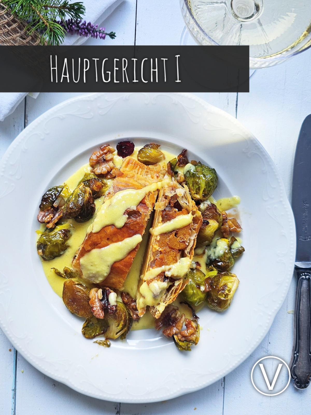 BUTTERNUSS-KÜRBIS-WELLINGTON MIT ZWIEBEL-CRANBERRY-CONFIT, GRANATAPFEL-WALNUSS-ROSENKOHL & WEISSER BALSAMICO-BEURRE BLANC