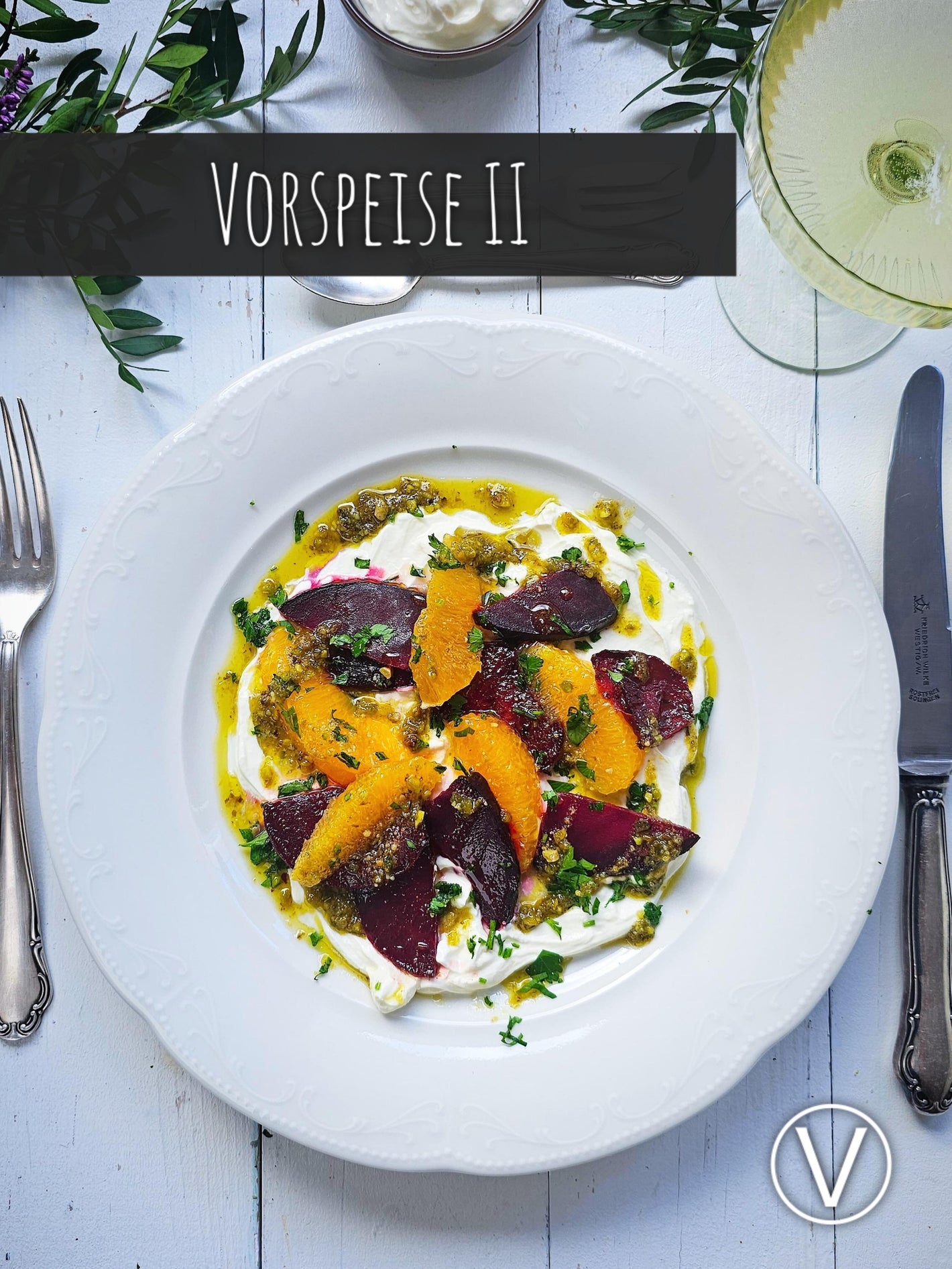Unsere zweite Vorspeisenoption kombiniert warme, leicht süßliche Rote Bete aus dem Ofen mit einer cremig-luftigen Ricotta-Frischkäse-Basis. Dazu kommen saftige Orangenfilets für Frische und ein intensives Pistazienpesto für Tiefe und Aroma. Eine moderne, winterliche Caprese-Variante, die warm und kalt verbindet und sofort Lust auf den nächsten Gang macht.Zutaten: Rote Bete, helle Misopaste, Ahornsirup, Ricotta, Frischkäse, Orange, Pistazienpesto, gehackte Pistazien