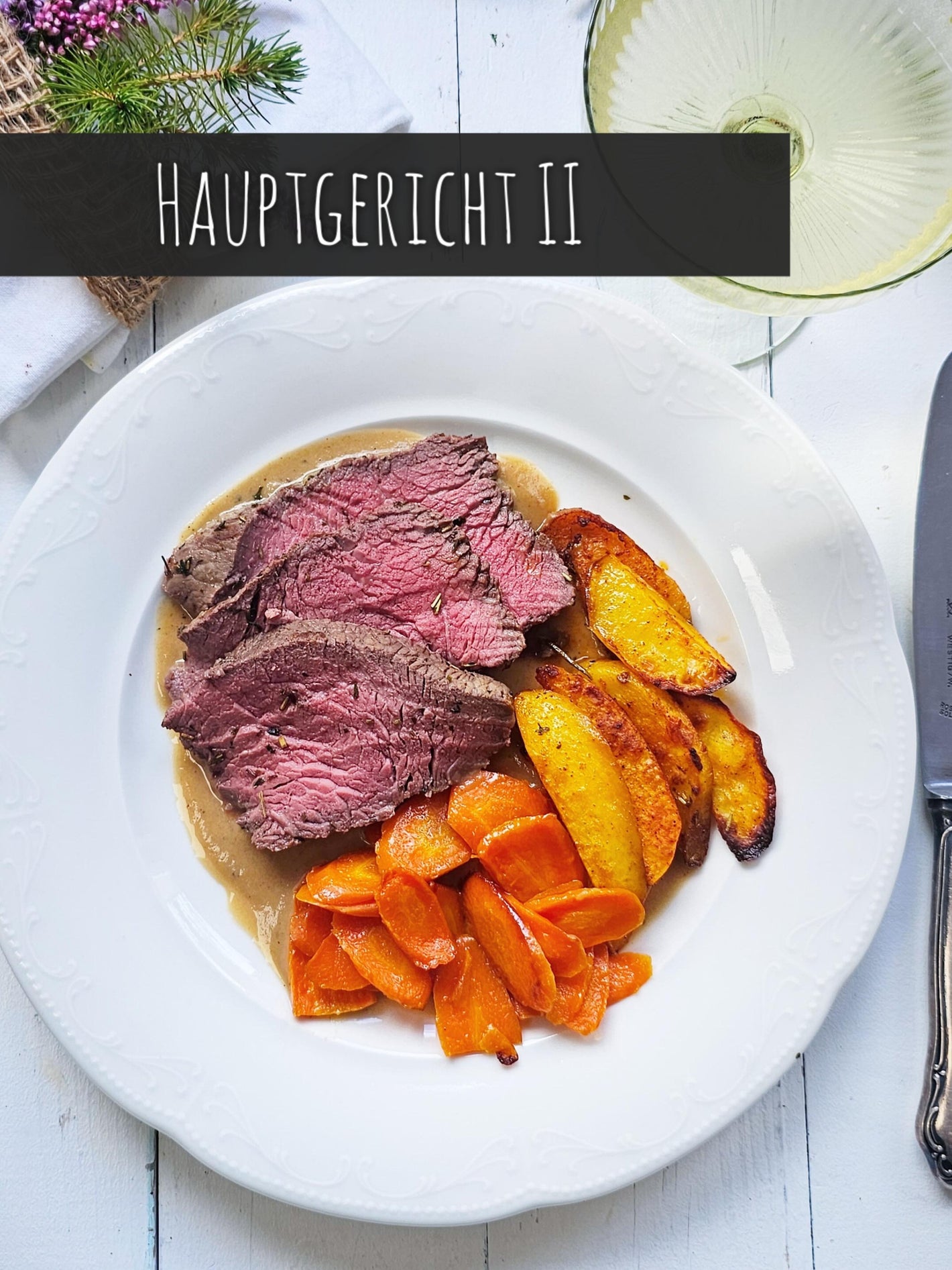 & BRATAPFEL-SCHALOTTEN-SAUCEEin zarter Rinderbraten aus der Steakhüfte, langsam angebraten und sanft im Ofen gegart. Die Rosmarin-Knoblauch-Zitronenbutter sorgt für eine frische, aromatische Würze, die perfekt zu den knusprigen Röstkartoffeln und den leicht süß glasierten Honig-Möhren passt.