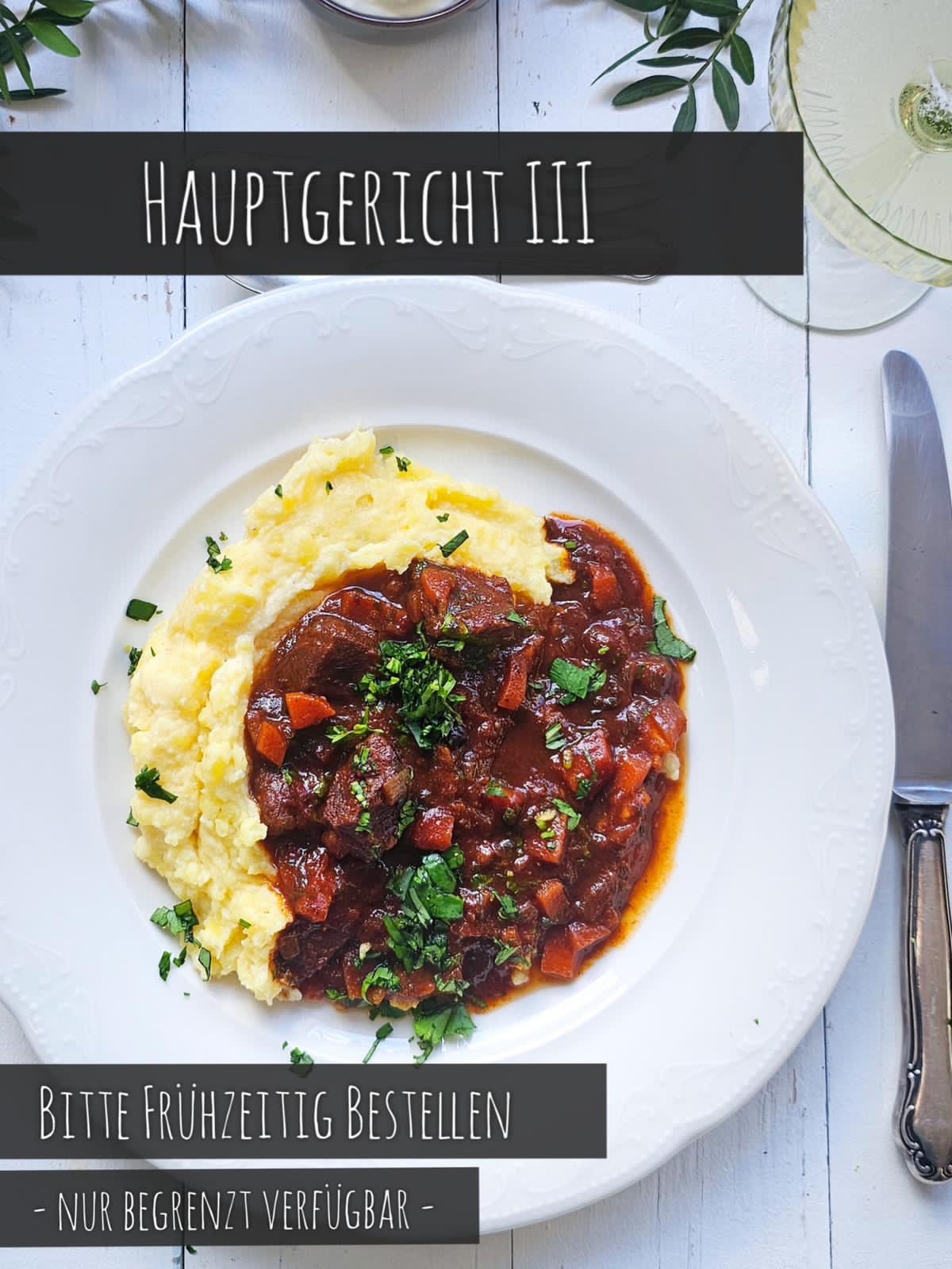 Der winterliche Wildgewürzmix bringt Tiefe und leichte Zitrusnoten in die Sauce. Dazu kommen eine frische Petersilien-Zitronen-Gremolata und ein cremiges Kartoffel-Mandel-Püree, das alles perfekt abrundet. Ein festlicher Hauptgang, der edel wirkt, ohne abgehoben zu sein – genau richtig für ein besonderes Festtagsessen.Zutaten: Hirschgulasch, rote Zwiebel, Karotte, Tomatenmark, Rotwein, Portwein, Crema Balsamico dunkel, Feigenkonfitüre, Rinderbrühe, Wacholderbeere, Lorbeerblatt, Pfefferkörner, Pimentkorn, Zimt, getrocknete Orangenschale, Zitronenabrieb, Knoblauch, Kartoffeln, gemahlene Mandeln, Petersilie (frisch)
